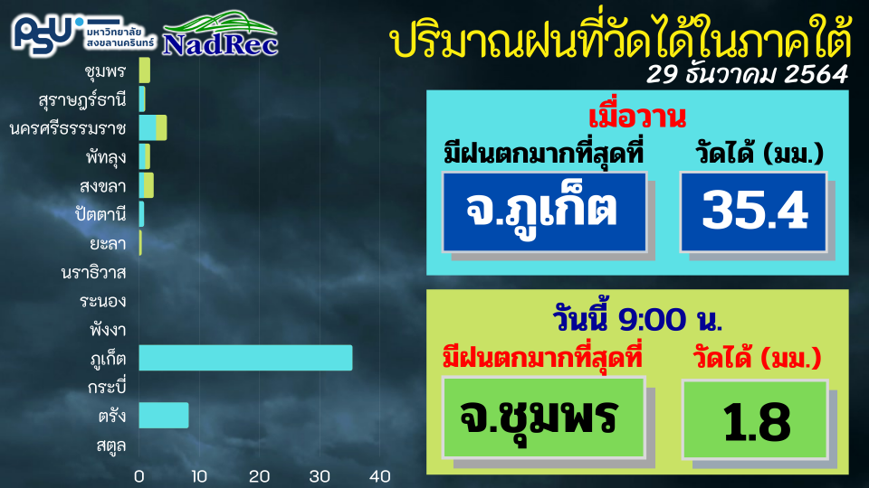 - สถานการณ์น้ำฝน-น้ำท่าในจังหวัดสงขลา ประจำวันที่ 29 ธันวาคม 2564 เวลา 9:00 น.