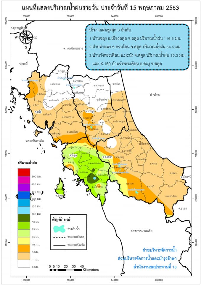15 พฤษภาคม 2563 สถานการณ์ภัยแล้งในพื้นที่ จ.พัทลุง จ.ตรัง จ.สตูล และ จ.สงขลา ปริมาณน้ำในอ่างเก็บน้ำขนาดกลาง ที่อ่างเก็บน้ำคลองหลา จ.สงขลา และอ่างเก็บน้ำบ้านพรุเตย จ.ตรัง อยู่ในสภาวะวิกฤติภัยแล้ง สำหรับปริมาณฝนวันนี้มีฝนตกมากที่สุด อ.เมืองสตูล จ.สตู, วัดปริมาณฝนได้ 116 มิลลิเมตรที่มาข้อมูล: สำนักชล