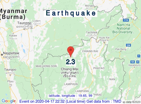 แผ่นดินไหวขนาด 2.3จุดศูนย์กลาง : อ.เชียงดาว จ.เชียงใหม่ (Amphoe ChiangDao, ChiangMaวันที่ - เวลา (ประเทศไทย) : 17 เมษายน 2563 22:32 น.วันที่ - เวลา (UTC) : 17 เมษายน 2563 15:32 Z.ละติจูด, ลองจิจูด : 19.65, 99ลึกจากผิวดิน : 5 กิโลเมตร