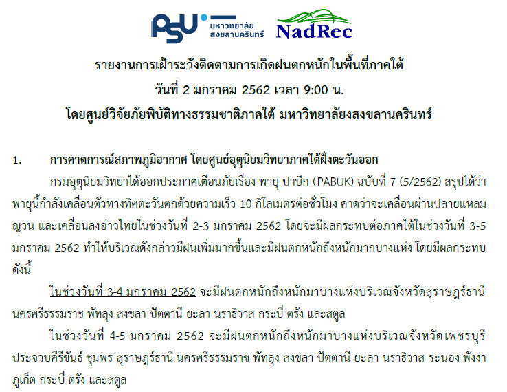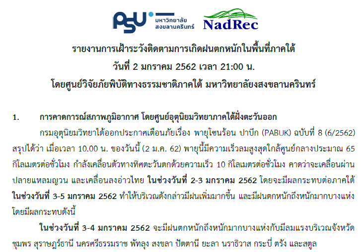 รายงานการเฝ้าระวังและติดตามการเกิดฝนตกหนักในพื้นที่ภาคใต้ เนื่องจากอิทธิพลของพายุ "ปาบึก" (PABUK) วันที่ 2 มกราคม 2562 เวลา 21:00 น (ดาวน์โหลดเอกสารด้านใน)