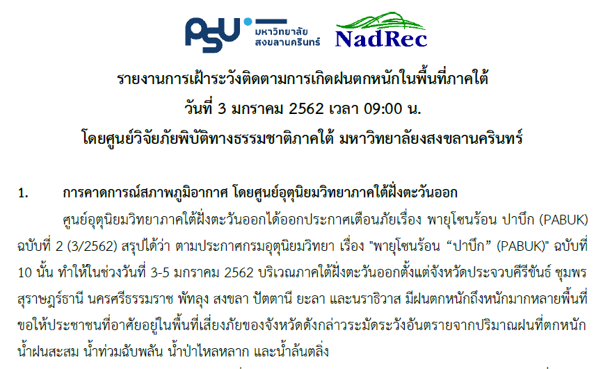 รายงานการเฝ้าระวังและติดตามการเกิดฝนตกหนักในพื้นที่ภาคใต้ เนื่องจากอิทธิพลของพายุ "ปาบึก" (PABUK) วันที่ 3 มกราคม 2562 เวลา 09:00 น (ดาวน์โหลดเอกสารด้านใน)