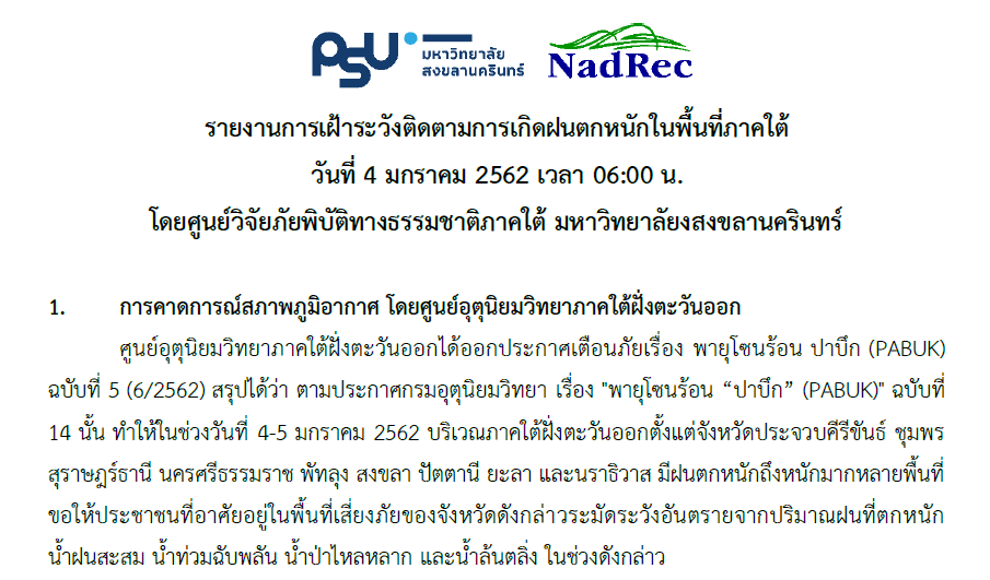 รายงานการเฝ้าระวังและติดตามการเกิดฝนตกหนักในพื้นที่ภาคใต้ เนื่องจากอิทธิพลของพายุ "ปาบึก" (PABUK) วันที่ 4 มกราคม 2562 เวลา 06:00 น (ดาวน์โหลดเอกสารด้านใน)